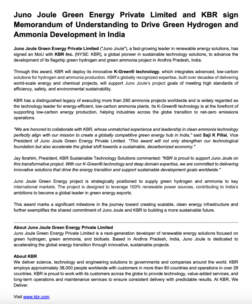 Juno Joule Green Energy Private Limited and KBR sign Memorandum of Understanding to Drive Green Hydrogen and Ammonia Development in India